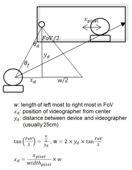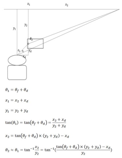 To calculate the direction of the user’s face, we adopted the HOG, which uses a face detection algorithm in Dlib []. HOG provides a significantly increased performance in human detection compared with traditional methods []. During the camera detection of the user’s face, it recognizes 68 face characteristics. In addition, it utilizes the OpenCV library to recognize the direction of the face using the front camera []. It then converts 2D vision data into 3D data. To account for this formula, we defined the location of the user’s face and the distance from the user’s face to the mobile phone (Figure 3). The calculation results of these two variables are subsequently utilized to calculate the direction of the object. To obtain the direction of the object, we can calculate θ2, as shown in Figure 4. At this stage, Holzmann and Hochgatterer indicated that we can calculate the value of y2 using single-camera stereo vision while recording a video [].
