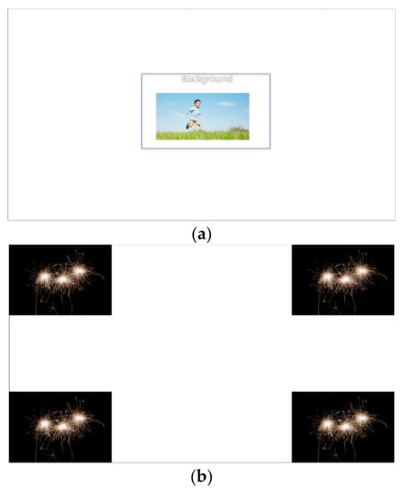 We measured error rates during object detection and tracking using two different materials, as shown in Figure 8. We used a TV as a medium to present the object virtually. For the purpose of object tracking, a target image shaped like a child moved quickly across the TV screen for 15 s. For the material speed, we adopted and used the moving speed of Microsoft PowerPoint’s animation function. The project was started under the assumption that the user might miss the target object when recording while looking at the mobile phone screen; hence, the error rate was measured during object tracking. In addition, we measured the object detection error rates. During the object tracking session, the participants were asked to track the target object as soon as possible. For object detection, we designed a simulated fireworks environment, and the target object appeared randomly for 1.5 s and then disappeared. During object detection, the participants were asked to find the location of the target object and record it.