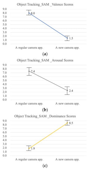 Emotional responses: We measured the emotional responses when conducting two different experiments (object tracking and object detection) and compared them under two conditions (using a regular camera app and using the new camera app). As described in Figure 7, each emotional dimension consists of a nine-point scale []. On the valence scale, the closer the participant response was to 1, the more pleasant the participant felt. In addition, the closer the participant response was to 9 on the scale, the more unpleasant the participant felt. On the arousal score scale, the closer the participant response is to 1, the more excitement the participant expressed. By contrast, the closer the participant response is to 9 on the scale, the more calm the participant felt. By contrast, on the dominance score scale, the points are reversed. The closer the participant response is to 1, the more dependency the participant expressed. In addition, the closer the participant’s response is to 9, the more independent the participant felt. We statistically analyzed the SAM results. First, for the object tracking valence score, the mean score when using the new camera application was 1.5, as compared to a mean score of 8.0 for the regular camera application (F = 304.20; p < 0.01). The object tracking arousal scores were 2.4 when using the new camera application, as compared with a mean score of 7.4 when using a regular camera application (F = 52.57; p < 0.01). For the dominance score, the mean when using a new camera application was 8.5, compared to a mean of 1.9 when using a regular camera application (F = 292.57; p < 0.01). The object tracking results indicate that the participants felt a sense of pleasance, excitement, and independence when using the new camera application.