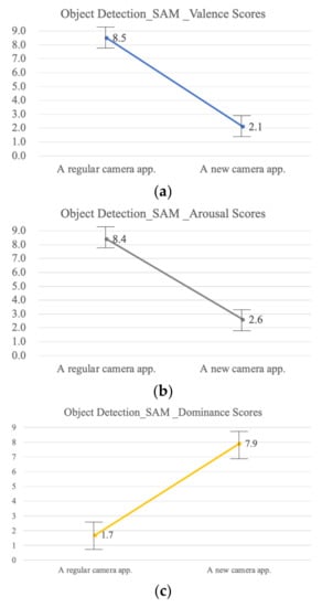 During the object detection experiment, for the arousal dimension, the mean score when using the new camera application was 2.1, as compared to a mean score of 8.5 when using a regular camera application (F = 157.54; p < 0.01). For the arousal dimension, the mean score when using the new camera application was 2.6, as compared to a mean score of 8.4 when using a regular camera application (F = 82.27; p < 0.01). For the dominance dimension, the mean score when using the new camera application was 2.6, compared to a mean score of 8.4 when using a regular camera application (F = 82.27; p < 0.01).