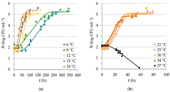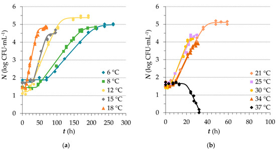 Growth curves of G. candidum isolate J in ultra-high temperature processed (UHT) milk without NaCl in the temperature ranges of 6–18 °C (a) and 21–37 °C (b). The points represent the observed values of counts of G. candidum. The continuous lines represent fitted growth curve according to the DMFit modelling program.