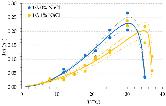 It was also obvious that the CM line representing the dependence of 1/λ on temperature with 1% NaCl moved down to lower values of 1/λ and toward a higher temperature range. Specifically, this means that the lag phase durations were prolonged, the differences between 1/λ values increased gradually with the temperature, and the predicted Topt and Tmax were higher by 4.3 and 2.0 °C (Table 2), respectively, as a result of the addition of salt in the milk. On the other hand, the cardinal temperatures that resulted from CM when applied to the specific growth rate of the isolate in milk with and without added salt were very close to each other. Similar cardinal temperatures (Tmin = 1.18 °C, Topt = 28.9 °C, Tmax = 37.3 °C) for G. candidum growth in milk were also reported by Šípková et al. [50]. The optimal specific growth rate of the isolate slightly decreased in the milk medium with 1% NaCl addition in contrast to its optimal growth rate in milk. These results indicate the slower growth of G. candidum at 1% NaCl, which is in accordance with the findings of Eliskases-Lechner et al. [7] and Uraz and Özer [51]. However, strain-dependent sensitivity of G. candidum on salt concentration should also generally be considered [2,4,44].