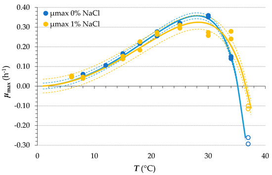 Plots of the maximum specific growth rate of G. candidum J versus temperature (6–37 °C) in milk (blue line) and milk with 1% NaCl (yellow line) according to the CM (solid line). The symbols indicate the experimental μmax estimated from the primary growth curves at each incubation temperature. Solid lines represent the fitted model estimates. Dashed lines represent the 95% confidence intervals.