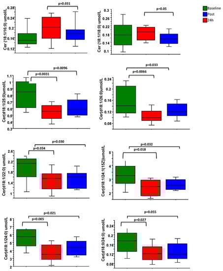 - Kasumov, T.; Solomon, T.P.; Hwang, C.; Huang, H.; Haus, J.M.; Zhang, R.; Kirwan, J.P. Improved insulin sensitivity after exercise training is linked to reduced plasma C14:0 ceramide in obesity and type 2 diabetes. Obesity 2015, 23, 1414–1421. [Google Scholar] [CrossRef] [PubMed]