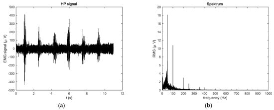 To develop an efficient algorithm of EMG signal processing, the frequency characteristics of the registered signals were first calculated. Raw signals contain a high level of low-frequency disturbances due to the very high impedance of the front analog circuit. This part of the signal’s spectrum has to be removed first using high or band-pass filtering. The typical signals and their spectral characteristics are demonstrated in Figure 1 and Figure 2.