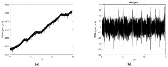 The example of the EMG signals measured on the right abdominal muscle, (a) raw signal, (b) after HP filtering using 3rd order Butterworth HP filter, fc = 2 Hz.