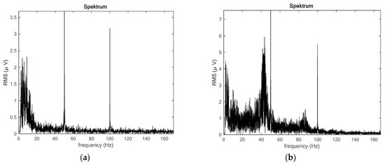 As expected, there is a high impact of environmental power line parasitic signal sources. It has been experimentally confirmed that the electrical contact between skin and the surface electrodes has the dominant importance in reducing this parasitic impact. The examples showing the contribution of 50 Hz and the higher spectral components are presented in Figure 2.