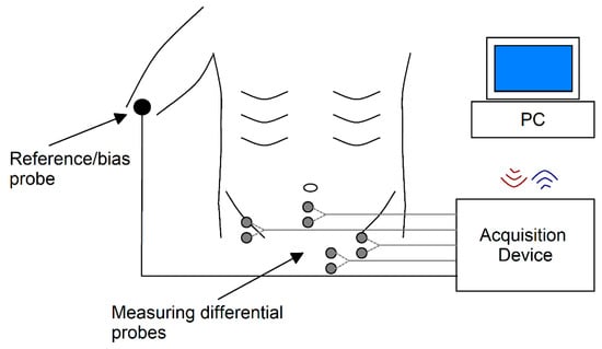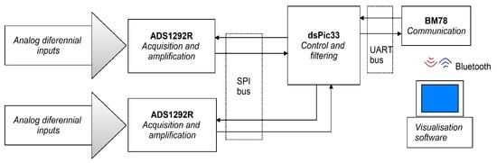 The measuring system is built of a microcontroller belonging to the dsPIC33 family, equipped with two ADS1292 analog-to-digital converters and the BM78 Bluetooth communication module. The used transducer is a specialized measuring system intended for the measurement of biopotentials—Figure 6. Each of the two ADS1292 chips allows differential measurement in two channels. Thus, the entire device enables the simultaneous measurement of four interesting areas of the patient’s body. The transducers are of the delta-sigma (ΔΣ) type. They provide simultaneous sampling with 24-bit resolution. They also have built-in programmable gain amplifiers. Thanks to these parameters, it is possible to connect the measurement probes almost directly to their terminals through RC input filters, avoiding additional sophisticated amplification circuits. An important parameter of the converters is their sampling frequency, which in this particular circuit is chosen at 2kS/s. The measurement resolution of 48 nV/bit was achieved. The actual measurement parameters are greatly influenced by the probes’ quality and the accuracy of their adherence to the human body. When the probes show high impedance, the interference caused by the devices located in close proximity, powered from the 50 Hz network, increases greatly. To avoid data acquisition when the probes are disconnected, the device continuously monitors the connection impedance. Thanks to the embedded forced test current mechanism, the system can measure the voltage drop caused by this current. When the measurement circuit impedance is higher than 20 kΩ, the device stops the acquisition and informs the user about the poor quality of the probe connection.