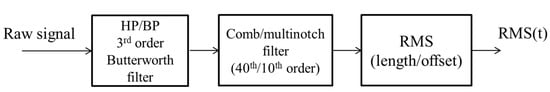 At first, the low-frequency drift signal is removed by the Band-Pass (BP) Infinite Impulse Response (IIR) filter. In order to achieve a trade-off between effectiveness and complexity of filtering, a 3rd order filter was chosen. Next, the comb 40th order filter was implemented to reduce the impact of 50 Hz energy-line interferences. The final stage of the proposed algorithm concerns the RMS signal generation by a parameterized procedure with user-defined offset and window length.