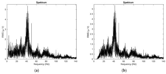 It has already been mentioned above that the ECG signal significantly interferes with EMG recordings. This strongly depends on the type of muscles being diagnosed and the location of the electrodes attached to the skin. To evaluate the contribution of cardiac activity in the presented experiments, only ECG signals were registered first. Next, the spectrum was calculated and compared with typical EMG and ECG signals superimposed on each other (see Figure 3 and Figure 4).