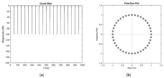 Comb filter, (a) magnitude for M = 40 and Δf = ±0.5 Hz, (b) poles and zeros distribution on the z-plane for comb filter.