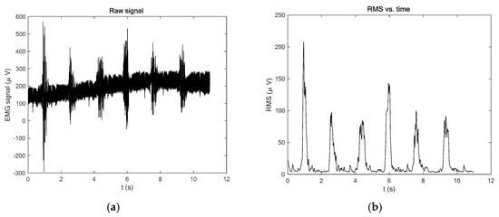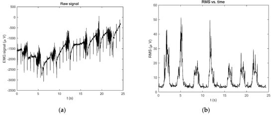 It has to be emphasized that the RMS signal recovery operates as a type of low-pass filtering depending on the length and the offset of the moving window. The longer length, the stronger the low-pass filtering. Choosing the appropriate values of length and offset is a compromise between the attenuation of EMG signal, the complexity of calculus, and the overall processing algorithm’s execution time. This is crucial for real-time applications.