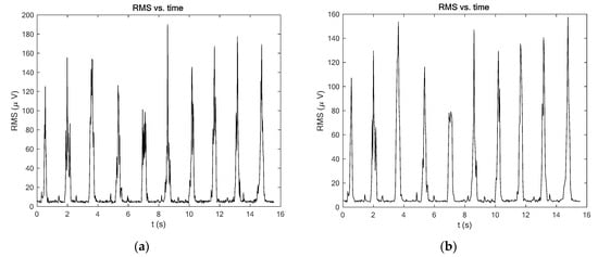 As already emphasized, depending on the position of the surface electrodes and the type of muscle diagnosed, the biopotentials resulting from the heartbeat may overlap the EMG signal. An obvious and general remark may be that the closer the electrode is to the heart, the stronger the influence of the ECG signal, which should be reduced as much as possible. The spectral bands of the ECG and EMG signals are only partially separated, as described in the introduction. Therefore, it should be taken into account that strong filtering of the low-frequency band corresponding to the heart rate may affect the EMG spectrum and consequently, alter the time-dependent RMS plot. Figure 16 shows an example of an RMS signal received for EMG recording with a high-level ECG signal superimposed and the RMS signal after removing the low-frequency spectral band.