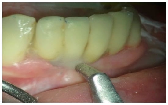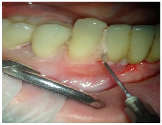 In group B, which was treated with the OHLLT protocol, the second microbiological sampling (T2) of the periodontal pockets was performed. After that, a new diode laser treatment + Sioxil®, as in the second session, was conducted upon irrigating the periodontal pockets with the Sioxil® solution (Figure 3), leaving the solution for at least 2 min and irradiating with a Wiser diode laser with a peak power of 2.5 W, T-On of 20 microns, T-Off of 80 microns, average power of 0.5 W, duty cycle of 100 microns and frequency of 10 KHz. In the control group C, the second microbiological sampling of the periodontal pockets was performed. The fourth session (T3) was conducted 9 months after the second session.