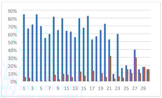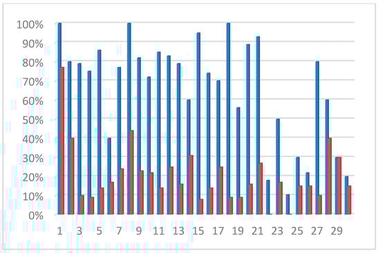 The results obtained from the study that evaluated the microbiological profile of 30 patients aged between 18 and 65 recruited and treated with three different types of protocols are summarized in the following paragraphs with the aid of Figure 5, Figure 6, Figure 7 and Figure 8 and Table 1 and Table 2.