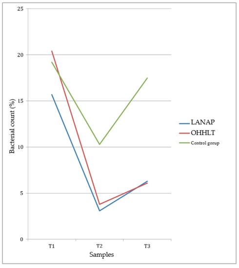 In particular, an average with the respective microbiological analysis was reported for each group examined (group A: patients treated following the LANAP protocol; group B: patients treated following the OHLLT protocol; and group C: patients treated exclusively with scaling and root planing) (Figure 5). The first sampling was carried out before the application of the protocols (T1), the second was 1 week after the end of the treatments (T2), and the third was 9 months after the end of the treatments (T3). At T2, I week after the beginning of protocols, the variation of the total amount of bacteria was calculated. Group A decreased by 80.3%, group B decreased by 81.4%, and group C decreased by 46.4%. At T3, 9 months after the end of the treatments, the variation of the total amount of bacteria was calculated. Group A decreased by 59.1%, group B decreased by 70.9%, and group C decreased by 8.9%. The statistical analyses are represented in Table 1 and Table 2.