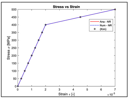 Figure 6 shows the stress-strain for a single element of the 1D bar. Ten equal load levels are applied to the bar. In the legend, Ana-NR represents the results from the analytical calculation of , Num-NR represents the numerical calculation of , and (Kim) represents the exact solution [14].
