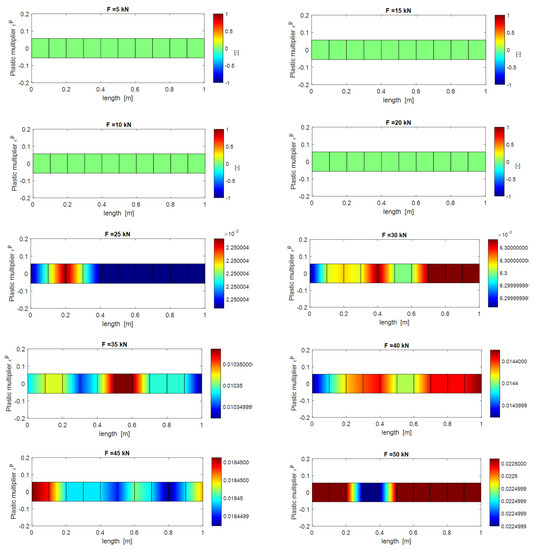 Figure 6 also shows that the yield strength is reached at 400 MPa, and beyond this value, the bar becomes in plastic mode. To better observe these areas, we divided the bar into ten identical elements of two nodes each. Ten successive loads in 5 kN steps were applied. The evolution of plasticity in the bar during these loads for the Num-NR model is presented in Figure 7.