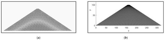 To test the efficiency of the algorithm in the case of a more complex behavior, we consider an example of a rockfill dam. This rockfill dam is assumed to be dry, homogeneous and symmetrical, and subject to its own weight. This dam has a width L of 320 m, a height h equal to 100 m and a crest length of 9 m. The depth of the dam axis is assumed to be infinite, which makes it possible to carry out a study of in-plane strain. Vertical and horizontal movements are zero at the base. Hooke’s law is used in cases where the material has an elastic behavior. In the plastic case, the Mohr–Coulomb model is used in its non-associated version to avoid excessive expansion of the material [9]. The material properties correspond to those used in [21] of a rockfill dam: Young’s modulus , Poisson coefficient , density , material cohesion c = 0, internal friction angle and material dilatancy angle . We propose to compare the results obtained with our code developed in the Matlab environment and those obtained using the commercial software PLAXIS for the mesh sizes presented in Figure 8. The construction of the dam is simulated by adding successive layers, with 20 layers in total.