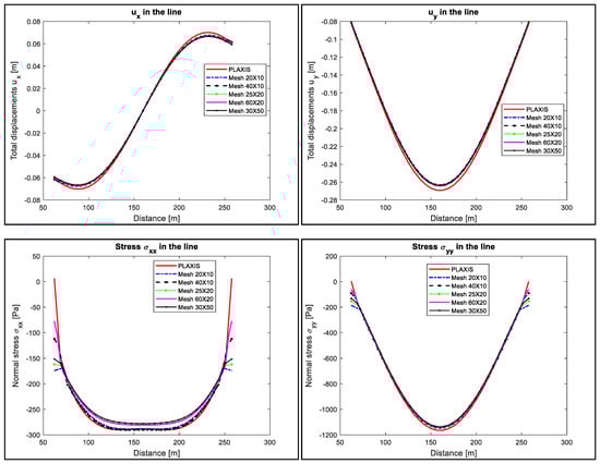 Displacements and stresses in the line considered for Matlab and PLAXIS models according to mesh size.