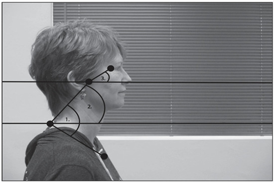 We analyzed postural alignment from still images using the ImageJ software (National Institutes of Health, Bethesda, MD, USA). Initially, we only intended to look at head–torso angle (shown as ‘1’ in Figure 1). However, those results were surprising, so we also analyzed neck and head angles with respect to horizontal (shown as ‘2’ and ‘3’ in Figure 1).