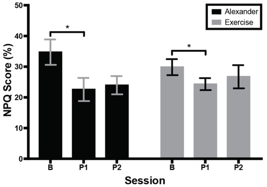 Figure 3 shows average NPQ scores of the Alexander and exercise groups across testing sessions. Eleven out of 16 participants reported a decrease in pain/disability immediately after the intervention, with a significant effect of session; F(1.6, 23.5) = 5.9, p = 0.01, eta2 = 0.16, Greenhouse–Geisser (ε = 0.84). There was no difference between groups. Post hoc comparisons showed that NPQ score was smaller at the first post-test than at baseline, p = 0.02. In the Alexander group, 6 out 8 participants reported a decrease in pain/disability immediately after the intervention, with an overall decrease of 11% and a 31% reduction from baseline. This improvement exceeds the threshold for minimum clinically important difference [35]. In the exercise group, 5 out of 8 participants reported a decrease in pain/disability immediately after the intervention, with an overall decrease of 5% and a 16% reduction from baseline. (This does not exceed the threshold for clinical significance [35].) No interactions were significant.