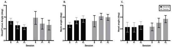 Comparison of posture during video-game task computed during 5 min play across groups and testing sessions. Errors bars are the standard error of the mean. (A) Head–torso angle (tragus, C7, manubrium). Higher angle indicates less forward head posture. (B) Neck angle (tragus, C7, horizontal). Higher angle indicates head farther back in space. (C) Head angle (orbit, tragus, horizontal). Higher angle indicates head extension. Error bars are the standard error of the mean. B = baseline; P1 = 1st post-test; P2 = 2nd post-test.