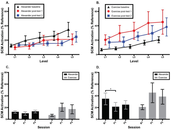 Normalized bilateral sternocleidomastoid (SCM) muscle activity as a percent of accepted voluntary contraction during cranio-cervical flexion test (CFFT). (A) Alexander group SCM activity across three testing sessions and five CCFT levels. (B) Exercise group SCM activity across three testing sessions and five CCFT levels. (C) SCM activity across groups and sessions at CCFT Level 1. (D) SCM activity across groups and sessions at CCFT Level 5. Error bars indicate the standard error of the mean. * signifies p < 0.05. B1 = baseline; P1 = 1st post-test; P2 = 2nd post-test.
