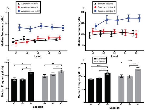 Median frequency of bilateral sternocleidomastoid (SCM) muscle activity during cranio-cervical flexion test (CFFT).). (A) Alexander group SCM activity across two groups, three testing sessions, and five CCFT levels. (B) Exercise group SCM activity across groups, sessions, and CCFT levels. (C) SCM activity across groups and sessions at CCFT Level 1. (D) SCM activity across groups and sessions at CCFT Level 5. Error bars indicate the standard error of the mean. Higher SCM activation indicates more muscle activity. * signifies p = 0.01. ** signifies p = 0.007. **** signifies p < 0.0001. B1 = baseline; P1 = 1st post-test; P2 = 2nd post-test.