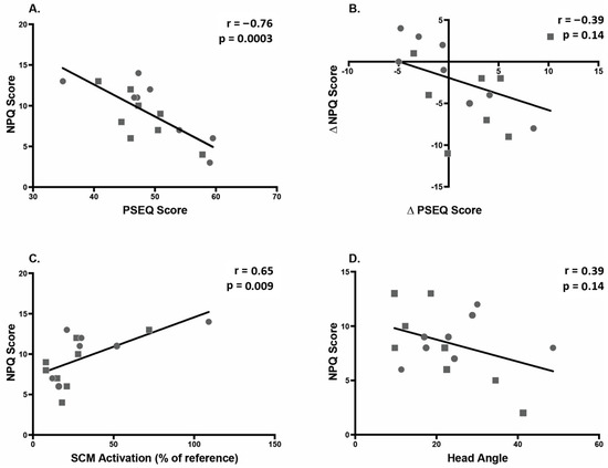 Table 4 shows correlations of NPQ score and change in NPQ score with other outcome measures. Figure 8 shows scatter plots of the relationships with the highest correlations. At second post-test, NPQ score correlated significantly with PSEQ score (r = −0.76) and neck muscle amplitude (r = 0.65). There were two non-significant correlations of note: change in NPQ with change in PSEQ (r = −0.39) and NPQ with head angle at P1 (r = −0.39). There was no correlation between posture and muscle activation.