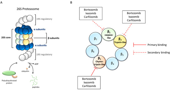 The inhibition of proteasome as an approach to induce cell apoptosis is especially effective in hematological cancer cells, such as MM cells, because of their dependence on proper proteasome function to ensure the degradation of aberrantly folded proteins [55,56]. Indeed, the vast number of immunoglobulins produced by malignant PCs makes these cells more sensitive to the proteasome inhibition than the normal ones [56]. One of the early mechanism of action imputed to PIs was the abrogation of the degradation of inhibitory proteins of the kappa-beta (kB) family, IkB, leading to cytoplasmic recruitment and inhibition of nuclear factor kappa-light-chain enhancer of activated B cells (NFkB) [57]. This aspect has special relevance for MM, where the adhesion of malignant PCs to BM microenvironment cells leads to the NF-κB-dependent production of antiapoptotic proteins and IL-6 [58]. Additionally, proteasome inhibition alters the equilibrium between protein synthesis and removal of misfolded proteins, which leads to endoplasmic reticulum (ER) stress and unfolded protein response (UPR) and, ultimately, to apoptosis [55,59]. Based on this evidence, several PIs have been developed. According to their chemical structures, they have been divided in different classes: boronic acid derivatives, epoxyketones, and salinosporamides. A brief description of these classes of PIs will be provided in the next paragraph. A schematic diagram of the 26S proteasome and the subunit specificities of PIs are reported in Figure 1.