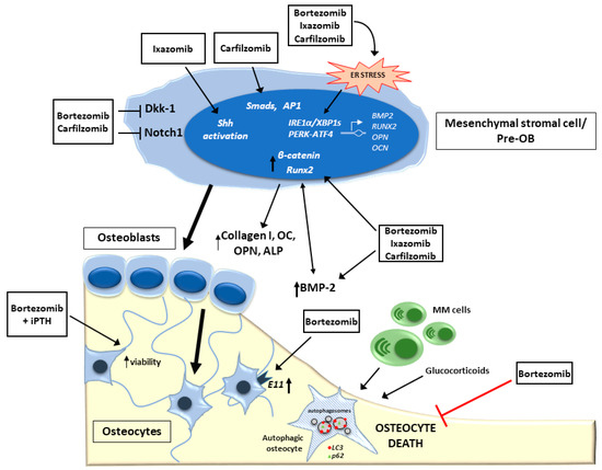 Biological consequences of proteasome inhibition in MM bone microenvironment. PIs increase the activity of Runx2 in pre-OBs with a consequent increased expression of collagen I, OC, OPN, and ALP through a Wnt-independent stabilization of β-catenin. Bortezomib also increases BMP-2 expression in osteoblastic cells that, in turn, increase the levels of the transcription factor Runx2, enhancing bone formation. The treatment with carfilzomib enhances the activity of Smads and AP1 transcription factors, promoting early OB progenitors’ commitment. The bone anabolic effect of PI treatment, in particular bortezomib and carfilzomib, has been correlated with Notch1 and Dkk-1 inhibition with subsequent enhancement of OB formation. Bortezomib and ixazomib promote the ER stress, mainly through the activation of IRE1α/XBP1s and PERK-ATF4 signaling pathways leading to increased expression of OB markers. The anabolic effect of ixazomib is also associated with the activation of SHH pathway by inducing the nuclear translocation of Gli1 in MSCs and OB differentiation. MM cells and high doses of glucocorticoids induce autophagic death in osteocytes by modulating the levels of two autophagic markers LC3 and p62. Bortezomib blunts osteocyte death by reducing LC3 and increasing p62 protein levels. Bortezomib also potentiates the effect of intermittent PTH on osteocyte viability. Additionally, bortezomib stabilize the transmembrane glycoprotein E11, leading to increased osteoblast–osteocyte transition.