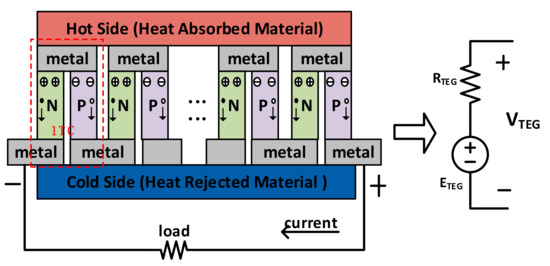 A TEG is composed of a series of thermocouples (TC) sandwiched between two high-thermal-conductivity substrates. It can be modeled as a DC voltage source ETEG and an internal resistance RTEG connected in series, as shown in Figure 1. According to the Seebeck effect, the ETEG can be expressed as