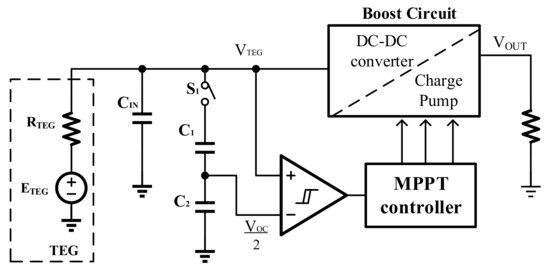 According to the TEG electrical model in Figure 1, the maximum output power occurs when the TEG output voltage (VTEG) is half of its present open-circuit voltage (ETEG). A conventional MPPT circuit using the FOCV technique is illustrated in Figure 2. The circuit periodically turns on S1 and turns off the connection of the TEG and boost circuit to sample the open-circuit voltage on the TEG. During the boost circuit operation, the control signals of the boost circuit are automatically tuned by a hysteresis comparator and an MPPT controller to keep VTEG around half of VOC [20,21]. Although the FOCV technique is simple to implement, it must frequently stop the boost circuit for a while to sample the VTEG, which reduces the system efficiency. To overcome the drawback of the FOCV technique, the P&O technique is proposed for TEG by Rawy [22] and Bandyopadhyay [23]. However, the tracking efficiencies fluctuate wildly, especially for a wide RTEG range.