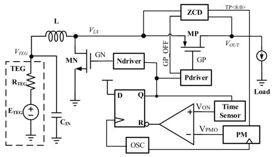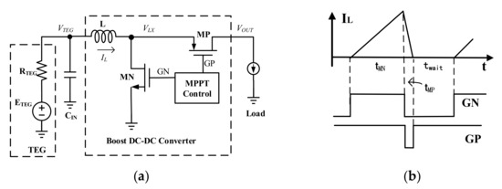Considering the low output voltage of TEG (<400 mV), a boost DC–DC converter is used to step up the voltage, as shown in Figure 3. According to the volt-second theory of inductors, the relationship between the voltage and on-time of a boost converter is