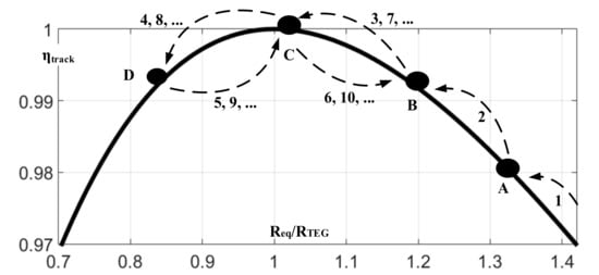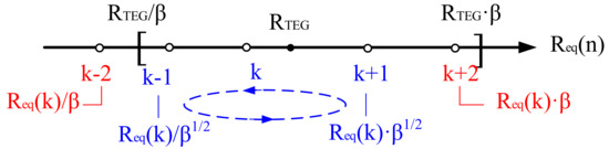 By analyzing Equation (7) and Equation (8), we find that if Req is in the range of RTEG/β to βRTEG, the tracking efficiency of the MPPT system will remain higher than ε. When Req(n) is a geometric sequence with a common ratio β1/2, there are at least three Req(n) in the range of RTEG/β to βRTEG for arbitrary RTEG, as shown in Figure 4.