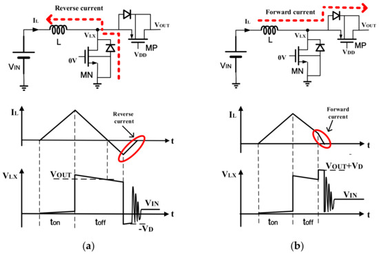 When the ZCD turns off MP slowly, a reverse current appears on the inductor for a time, as shown in Figure 7a. Because the drain–substrate PN junction of the MN forms a discharge path of the reverse current, the voltage at the right end of the inductor (VLX) will first fall to the negative PN junction voltage (−VD). When the ZCD turns off MP quickly, a little forward current remains on the inductor, as shown in Figure 7b. The forward current flows through the source–substrate PN junction of the MP. Therefore, the VLX will first jump to the sum of the substrate voltage and the PN junction voltage (VOUT + VD).