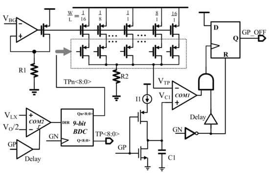 Based on the above analysis, there are two different situations of the VLX after the MP is turned off, and a predictive ZCD is proposed as shown in Figure 8. When the MP is turned on, current source I1 starts to charge capacitor C1. Until VC1 is higher than VTP, DFF is set by the COM1 and the ZCD output signal GP_OFF turns off the MP. In each converter cycle, after the MP is turned off, VLX is compared with VOUT/2 by a dynamic comparator COM2. Then the 9-bit bidirectional counter (BDC) is triggered to read the result of the COM2. If the BDC input DIR is high, the BDC output TP<8:0> is plus one. Otherwise, the TP<8:0> is minus one. The TPn<8:0> is used to control whether a series of proportional-current mirrors are connected to resistor R2, which defines VTP.