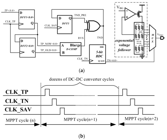At the beginning of each MPPT cycle, two groups of flip-flops (DFF1<8:0>, DFF2<8:0>) are triggered to save the present and previous time-length values TP<8:0>. After that, a digital comparator (D-COMP) compares these two values, and outputs a high level when the previous one is larger. Then, the D-COMP output (RVS) and the previous moving direction of tMN (TND_PRE) perform the XOR operation. If RVS is low, the present moving direction (TND) is set to equal to the previous. If not, the TND will be reversed. According to the TND, signal TN<4:0> will be made plus or minus one by 5-bit BDC when the pulse CLK_TN arrives. An exponential voltage follower consists of an amplifier, a transistor, and a series of resistors, and outputs a series of voltages, which grows exponentially. According to TN<4:0>, the output of the power modulator (VPMO) increases or decreases exponentially in each MPPT cycle by the multiplexer (MUX) and the voltage follower. Finally, the DFF3 is triggered to save TND for calculation in the next MPPT cycle.