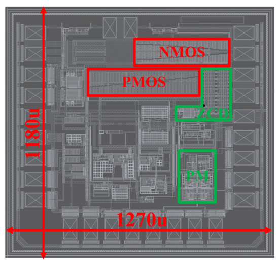 The proposed MPPT circuit using the time exponential rate P&O algorithm for TEG was implemented and simulated with a 110 nm standard complementary metal-oxide semiconductor (CMOS) process. The total silicon chip occupied an area of 1.5 mm2 (with pads), as shown in Figure 10.