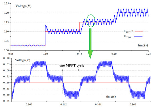 A voltage source ETEG and a resistance RTEG were connected in series to mimic the TEG. Figure 11 displays the simulation waveform of the TEG output voltage VTEG when ETEG changed from 50 mV to 400 mV and RTEG was 6 Ω. There is an enlarged view of the simulation results at the bottom of the figure. As described in Section 2, VTEG oscillated between the three states closest to ETEG/2, which is the maximum power point.
