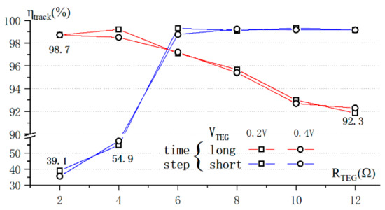 The input power of the DC–DC converter was obtained by the calculator module embedded in Spectre. The input power was divided by the ideal maximum power output of the TEG to obtain the tracking efficiency of the proposed MPPT circuit. The simulation result of the tracking efficiencies was between 98.9% and 99.5% for ETEG from 50 mV to 400 mV and RTEG from 1 Ω to 12 Ω, as shown in Figure 12, indicating that the MPPT circuit maintained extremely high tracking efficiency in a wide TEG range.