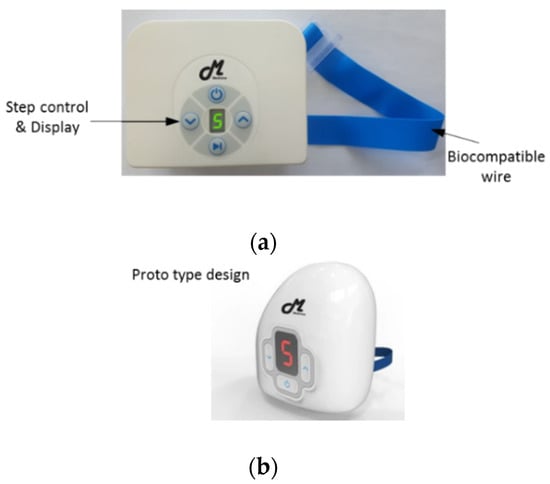 The prototype automatic tourniquet system and concept image of the final automatic tourniquet system are shown in Figure 1a,b, respectively. The length and tension of the strap are controlled using a DC motor integrated in the system. The pressure of the automatic tourniquet is designed to be selected from five different settings. The tension of the strap is controlled through system signal processing, and the tension level can be confirmed through the display module.