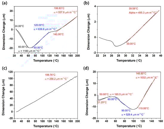 TMA analysis results for various straps: (a) Teflon; (b) latex tube; (c) silicone tube; and (d) thermoplastic elastomer.