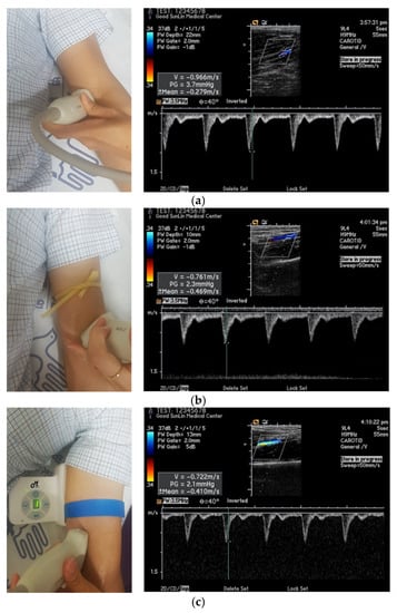 Experimental environment photograph and measurement picture of blood flow velocity using ultrasonic equipment: (a) normal; (b) using the latex tube; (c) using the fabricated automatic tourniquet.