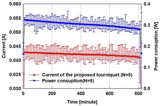 As shown in Figure 8a,b, the average potential of the battery was approximately 3.8 V and its cycling performance was very stable after 30 cycles. From the experimental results, the battery shows stable characteristics, which are applicable to the system in practice to enable safe operation. The operating time and power consumption characteristics of the portable automatic tourniquet system based on the evaluated battery were measured and the results are shown in Figure 9.