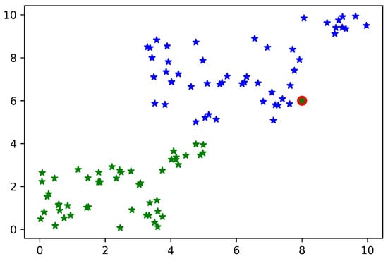 Most of the real-world datasets are not linearly separable; therefore, it is needed to draw a non-linear boundary. In case of non-linear datasets, two types of solutions can be adopted. One is to use soft-margin SVM to accept some errors, and another is to draw a non-linear boundary. Linear separability of the data can be affected by a single point. Even a single sample in the dataset can affect the hyperplane of the SVM. If the data is sensed from sensors, then a single incorrect datum can make the dataset non-linear [16], as shown in Figure 1.