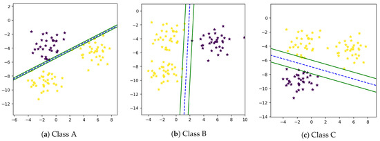 There are multiple classes in single feature space in a multi-class problem, due to which samples of one class may overlap another class [46]. Therefore, there is a need to separate these classes in a way that the maximum prediction accuracy will be achieved. The multi-class problem can be solved using the one-vs-all technique. It is not easy to find out a mathematical equation that separates all classes from one another. In many cases, it is not possible to find an optimal solution. In the One-Against-All technique, firstly proposed by Vapnik in 1995 [16], one class is classified from all other classes. First, we computer w and b and then draw a hyperplane between one and all other classes using these weights and bias as shown in Figure 3a–c.