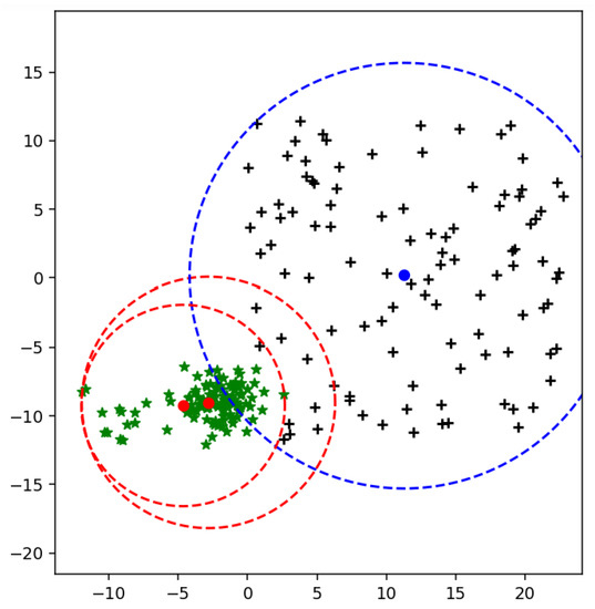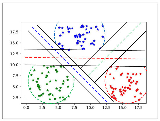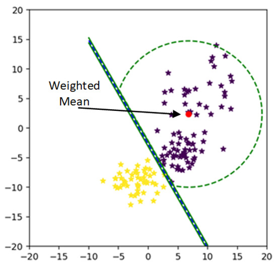 The weighted mean for the multiclass problem using one vs all technique is illustrated in Figure 8a–c. Furthermore, the MEB crosses the separating line; these points of MEB are excluded by calculating the circumference of the MEB. All the points which do not satisfy the constraint given in (4) are excluded from MEB.
