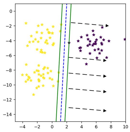 As we know in the binary classification problem, the training samples and the classes are given, and they all belong to , where the class labels are given as . SVM can be used for feature selection. Parameter optimization and feature selection are two primary perspectives to enhance the performance of the classifier. An innovative method based upon the genetic algorithm (GA) for feature selection and parameter optimization of support vector machine (SVM) is introduced to enhance the hospitalization cost model’s prediction accuracy [25]. Another technique [26] presents a different feature adoption method to deal with machine learning’s two main issues: class imbalance and high dimensionality. The proposed fixed strategy punishes the feature set’s cardinality via the scaling factors method also is applied with two support vector machine (SVM) formulations intended to deal with the class-imbalanced problem, namely Cost-Sensitive SVM and Support Vector Data Description. A lot of work has been done on feature selection by using SVM [27,28]. In [16] the author proposed a model called SVMRFE. They use the smallest weight to eradicate the features.